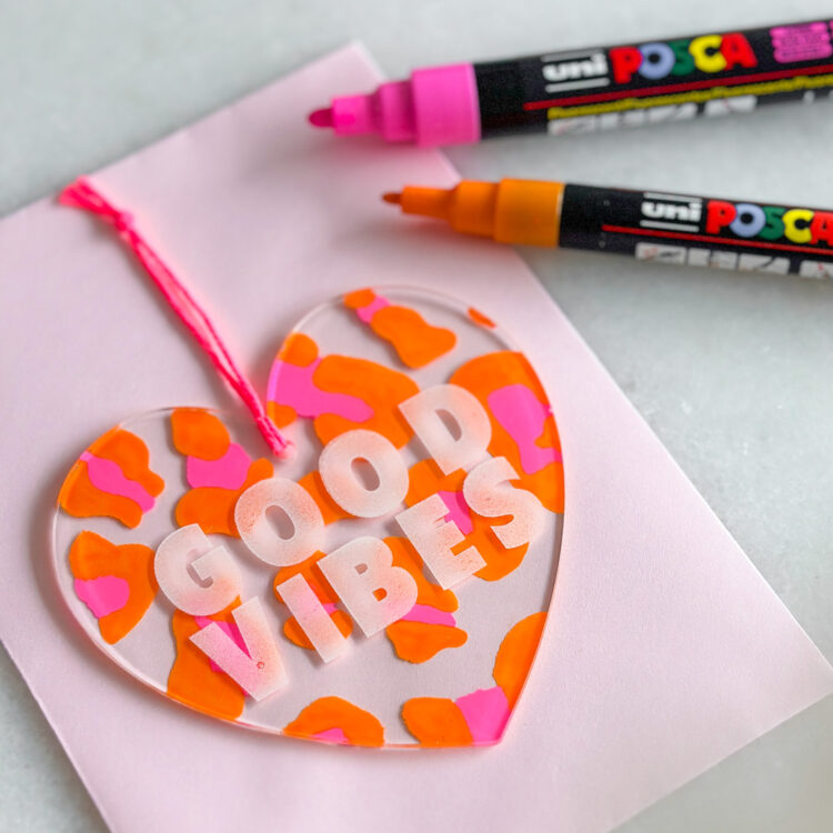 - Bei Verwendung einer Vorlage zuerst die Schrift auf den Acrylanhänger abpausen und anschließend den Hintergrund auf der Rückseite gestalten.