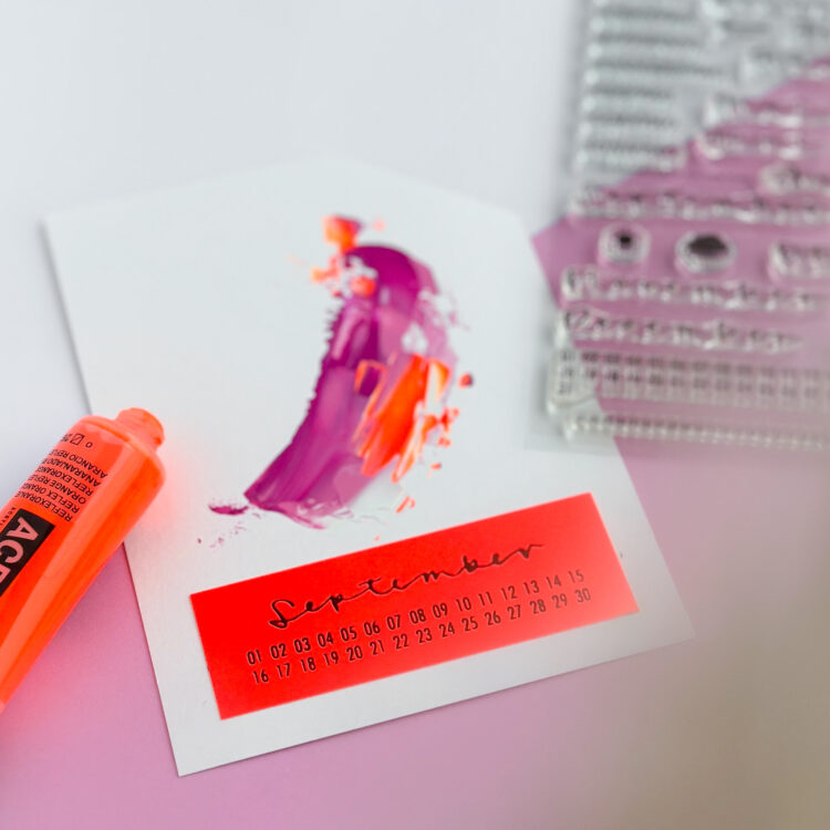 - Bei Monaten mit 28 oder 30 Tagen vor dem Einfärben mit der Stempelfarbe die Zahlen 29/30/31 mit Masking Tape abkleben und das Tape vor dem Stempeln wieder abziehen.