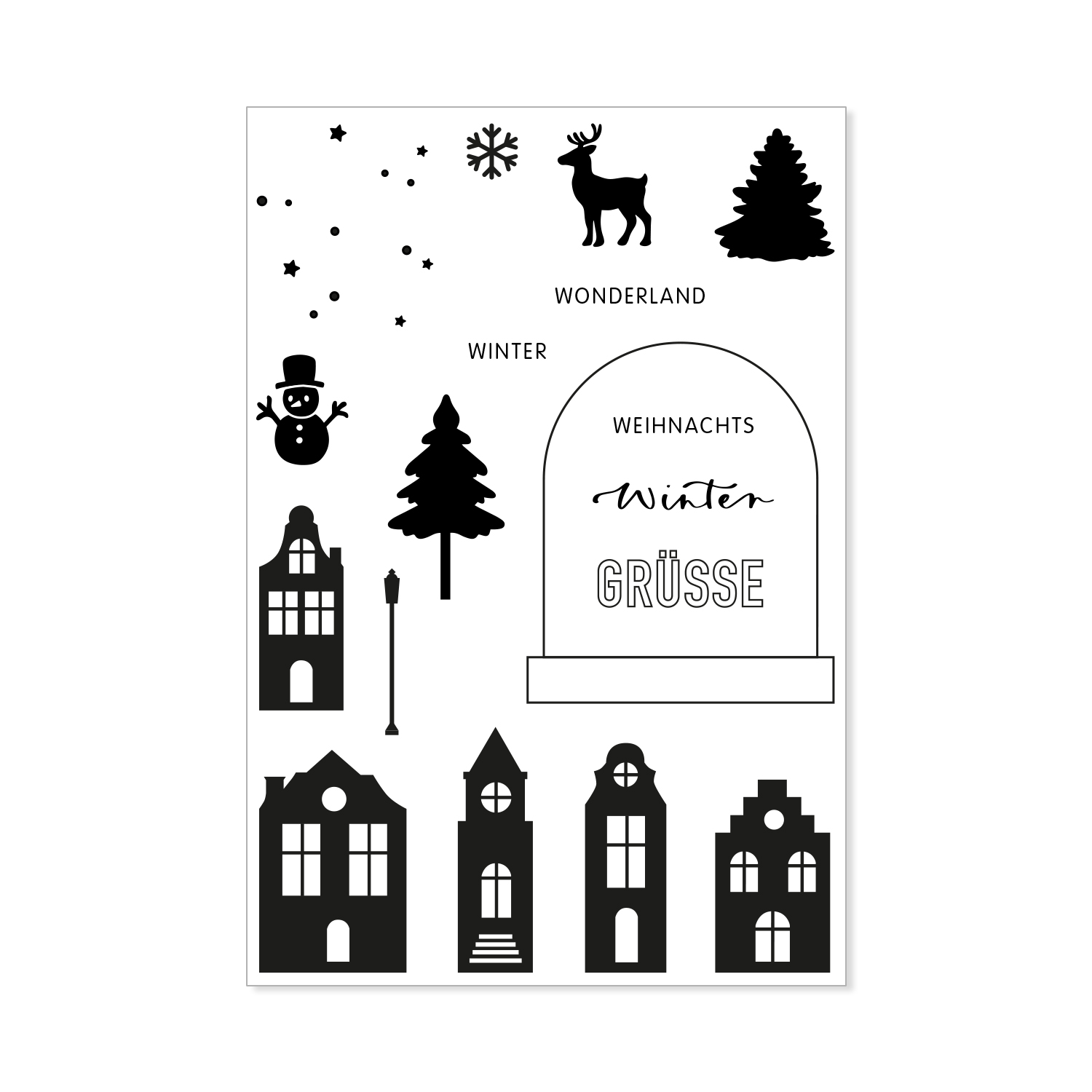 Mit dem exklusiv bei uns erhältlichen Stempelset “Winter Wonderland” kannst du individuelle Weihnachtskarten und kreative Projekte für Advent und Weihnachten gestalten. Das Set enthält 18 Clear Stamps aus hochwertigem Photopolymer mit verschiedenen weihnachtlichen Illustrationen sowie modernen Sans Serif Schriftzügen und einem Lettering von Frau Hölle zur Ergänzung. Die Motive lassen sich einzeln, in Kombination mit anderen Stempelsets oder z.B. zusammengesetzt als Winterdorf verwenden.