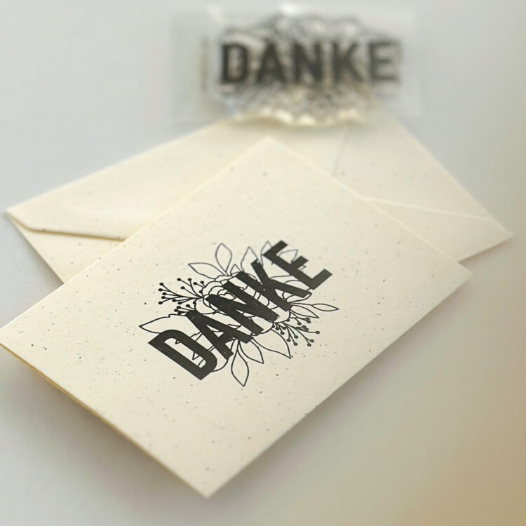 Mit dem exklusiv bei uns erhältlichen Stempelset “Danke” kannst du individuelle Dankeskarten für jeden Anlass gestalten. Das Set enthält einen einzelnen Clear Stamp aus hochwertigem Photopolymer mit DANKE Schriftzug und floralen Monoline-Illustrationen. Das Motiv wirkt einzeln besonders gut, lässt sich aber auch mit anderen Stempelsets verwenden. Es passt perfekt auf alle C7 Klappkarten und kann entweder nur als Outline gestempelt oder farbig ausgemalt werden.
